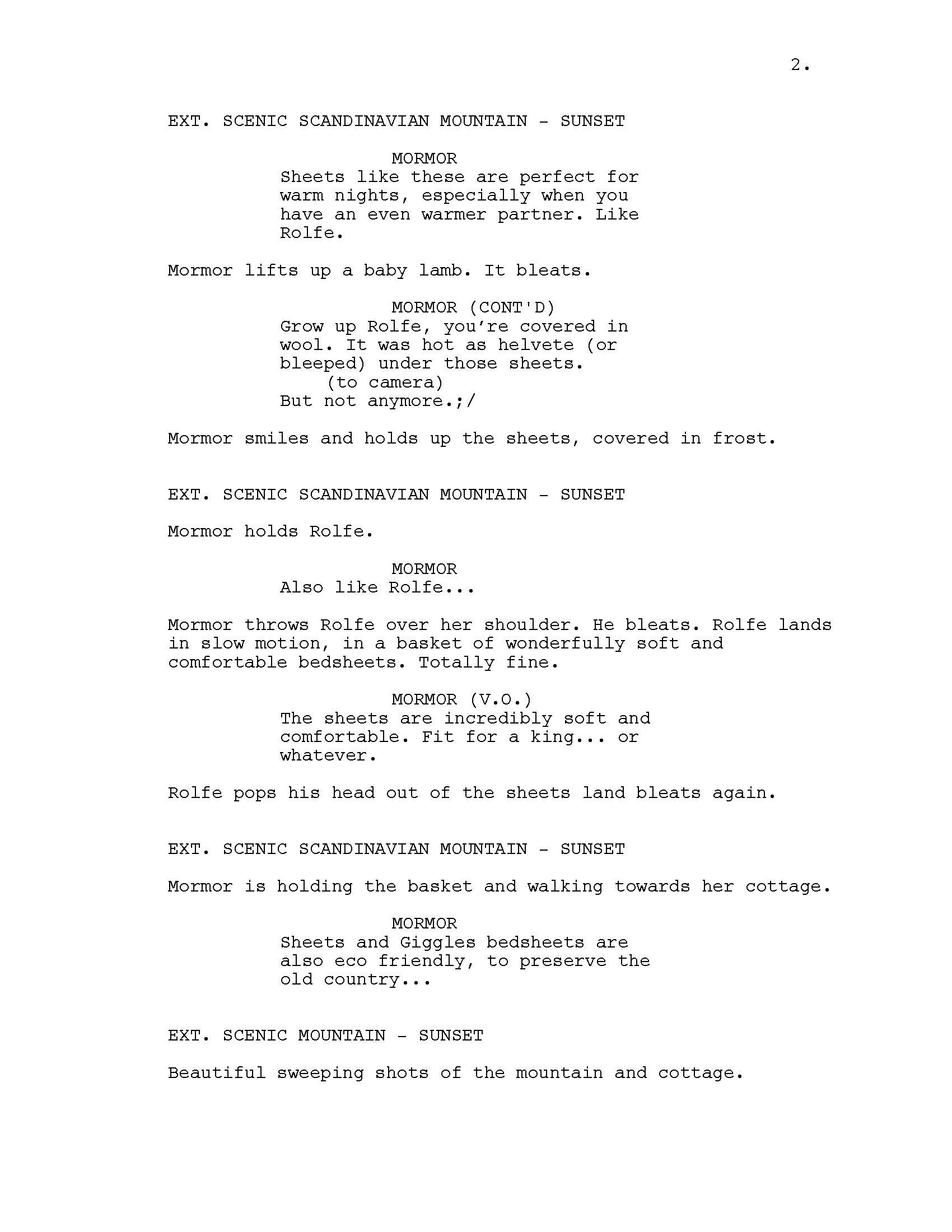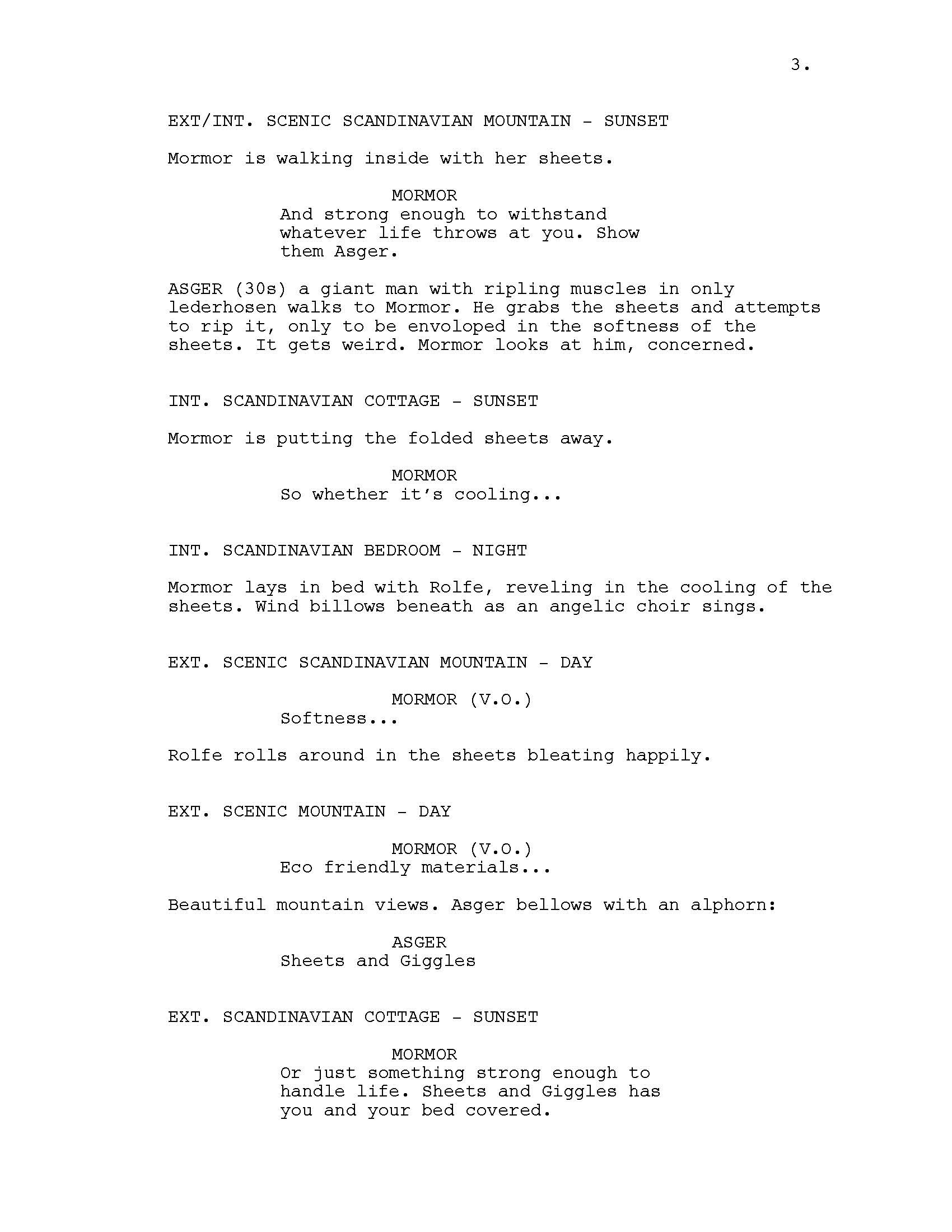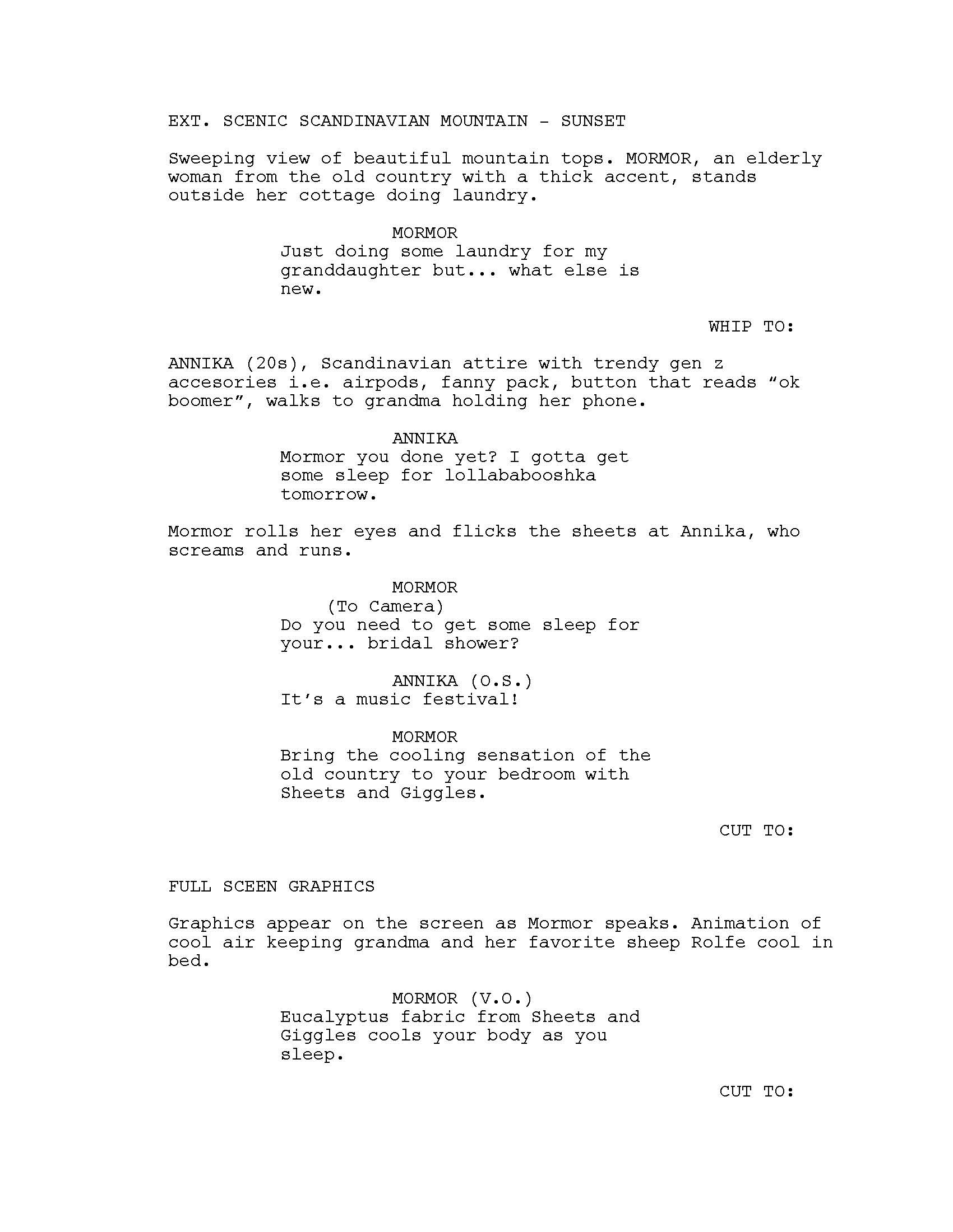 A narrative-driven comedy ad written as a pitch for Sheets & Giggles, a local textile company. This pitch was ultimately not produced, but I believe it showcases the brand's style, comedic tone, and nails the correct target audience.